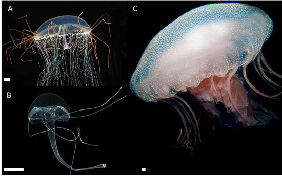 Figura 1. Las tres especies de medusas presentes en nuestra región que pueden provocar lesiones. A) Olindias sambaquiensis (agua viva o medusa de la cruz), B) Liriope tetraphylla (pica-pica o tapioca), y C) Chrysaora lactea. Escala: 1 cm. Fotografías de Álvaro Migotto, cifonauta.cebimar.usp.br.